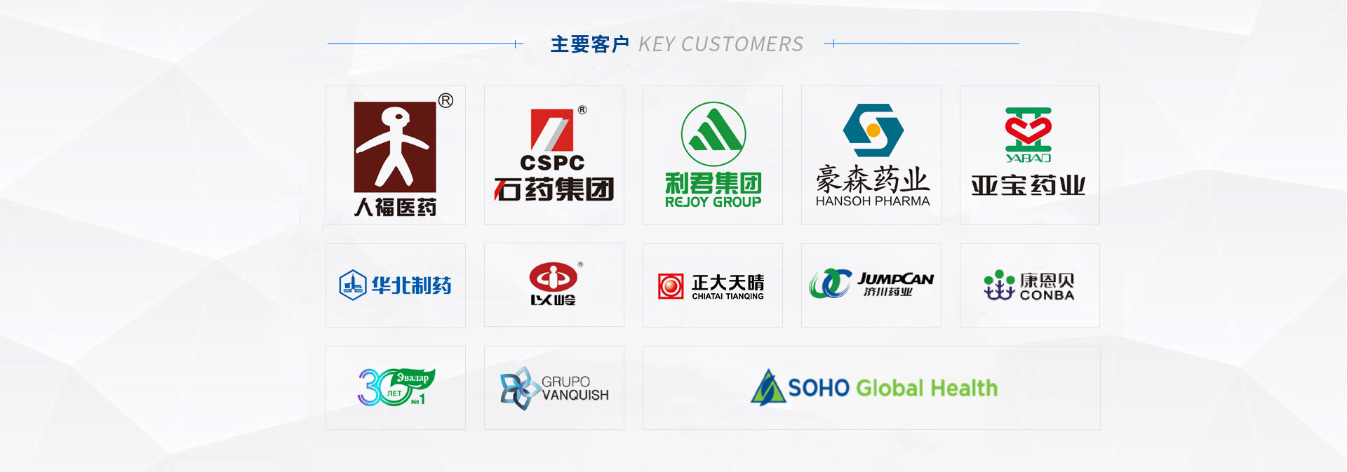 我們的客戶:華藥集團 | 石藥集團 | 九州藥業 | 以嶺藥業 | 正大天晴 |武漢人福 | 西安利君 | 山西亞寶 | 濟川藥業 | 中山達安基因 | 恒升醫學 | 九州通 | 康恩貝 |四環藥業 |豪森藥業 | 哈藥集團 | 東北制藥 | 武漢麥鑫利